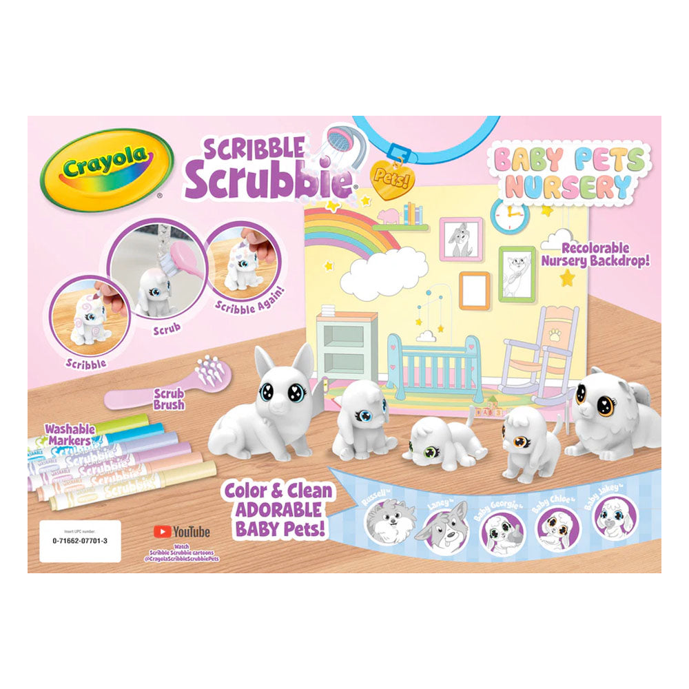 Explore the adorable Crayola Scribble Scrubbie Baby Pets Nursery pack with 6 cute baby pets and a recolorable nursery backdrop.