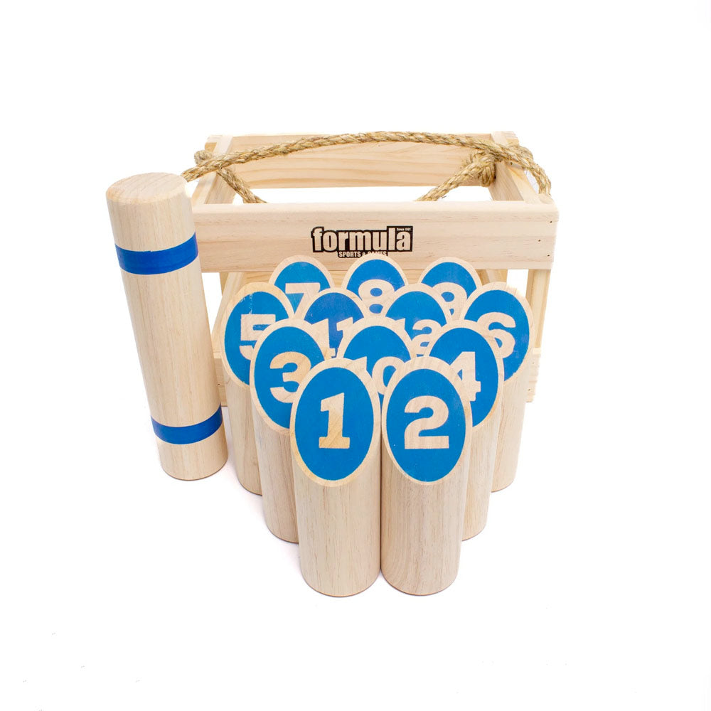 This set from Formula Sports includes 12 wooden pins, a quality throwing log to knock them down as well as a hardwearing crate to store and transport.