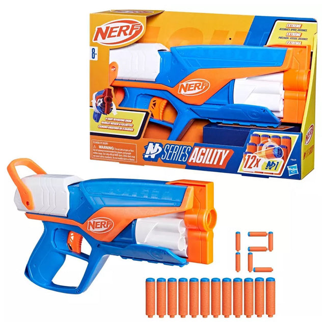 The Nerf brand levels up your game with high-performance Nerf N Series dart blasters and Nerf N1 darts! You have the skills as a Nerf battler, now you have the blaster and darts to gain a superior edge in indoor and outdoor play. From the creators of the foam dart, the Nerf brand unleashes the next evolution in foam dart blasting with Nerf N Series N1 darts, delivering EXTREME ACCURACY, SPEED, and DISTANCE! The Nerf N Series Agility dart blaster is built for games in which the action never stops and neither do you! Lightweight, compact, and simple to use, it's a great blaster essential for your Nerf stockpile. The Nerf N Series Agility blaster has a rotating drum with 6-dart capacity, includes 12 Nerf N1 foam darts, and has pull back priming. To play, load darts into the drum, pull back the priming slide, and pull the trigger to fire a dart. Nerf N Series blasters are compatible only with Nerf N Series N1 darts. Eyewear recommended (not included).